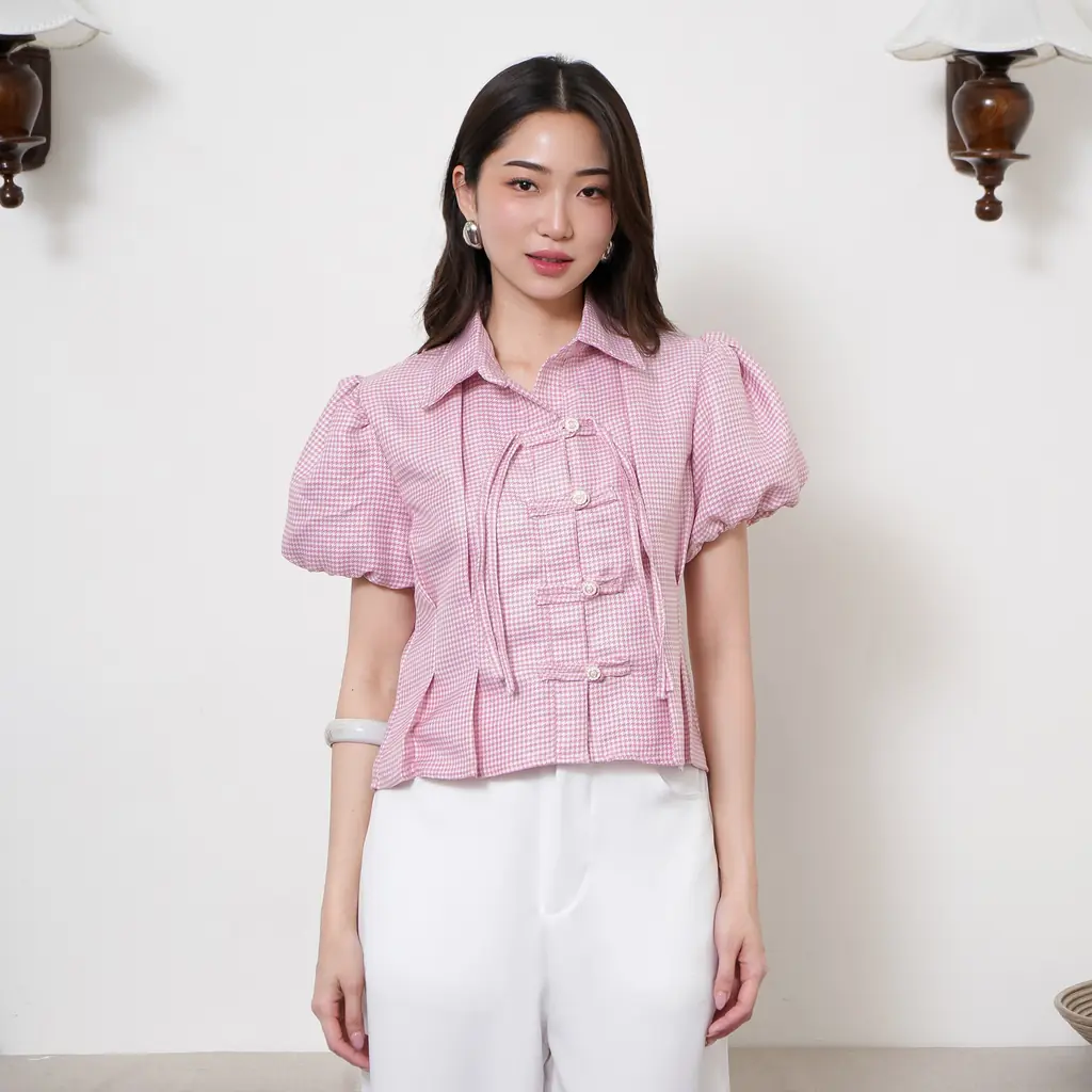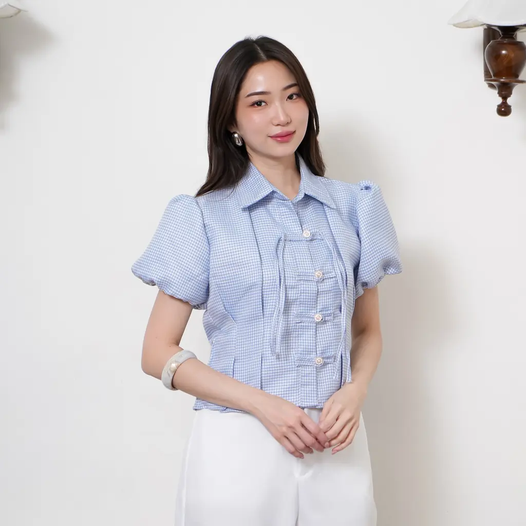 Atasan Wanita Tweed Kotak Lengan Balon Blouse Wanita Elegant